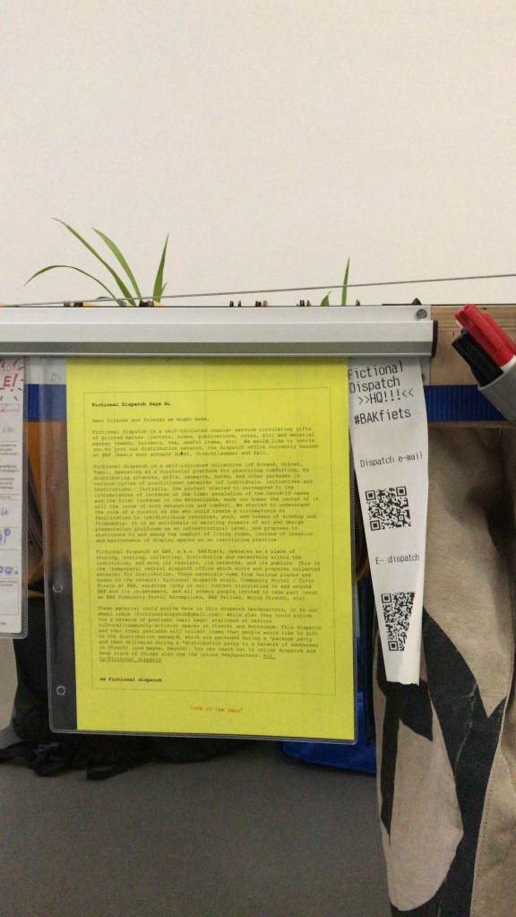 This round was at BAK Utrecht, part of Community Portal. The round activated for distribution of works, messages, letters of solidarity, care packages and art-works, among the solidarity network across Rotterdam and Utrecht. The round consisted of numbers of messenger rounds and federated dispatch posts across the two cities, to emphasise the slow accumulation of connections and material. The post located at, BAK Utrecht, KIOSK Rotterdam, VARIA.