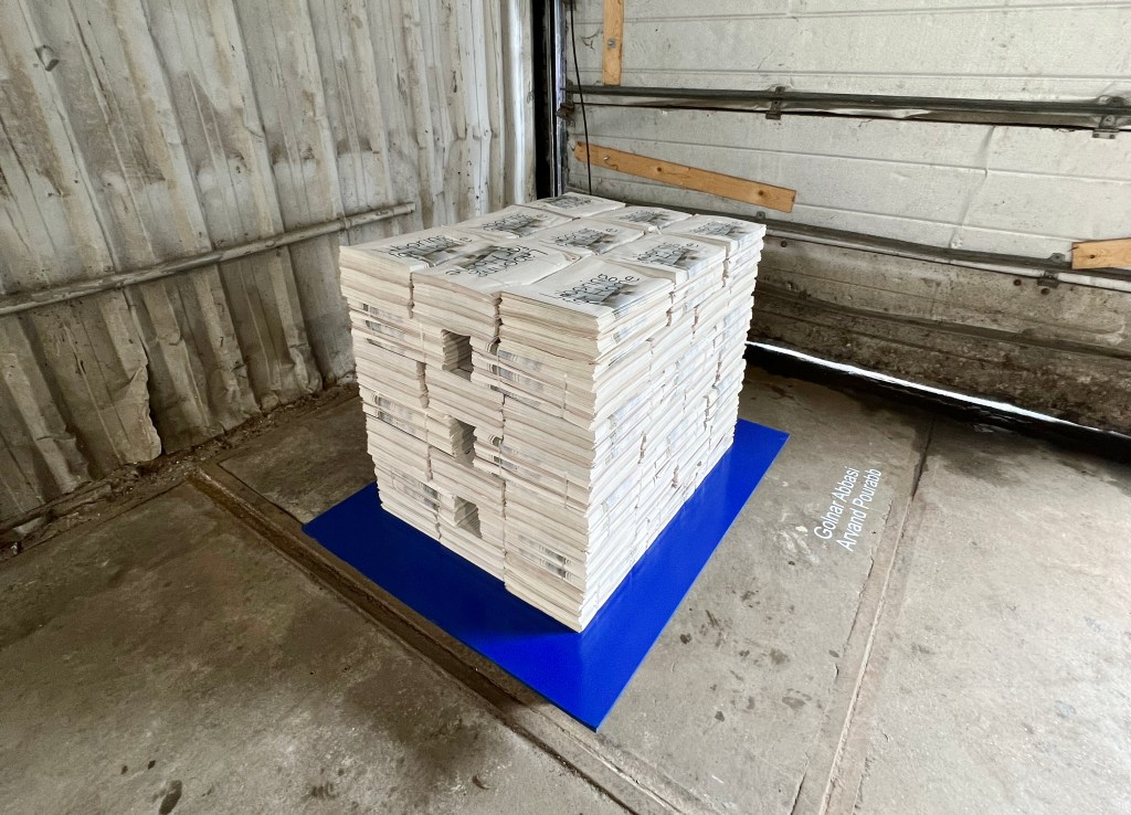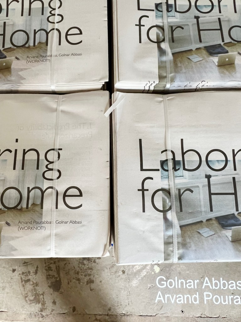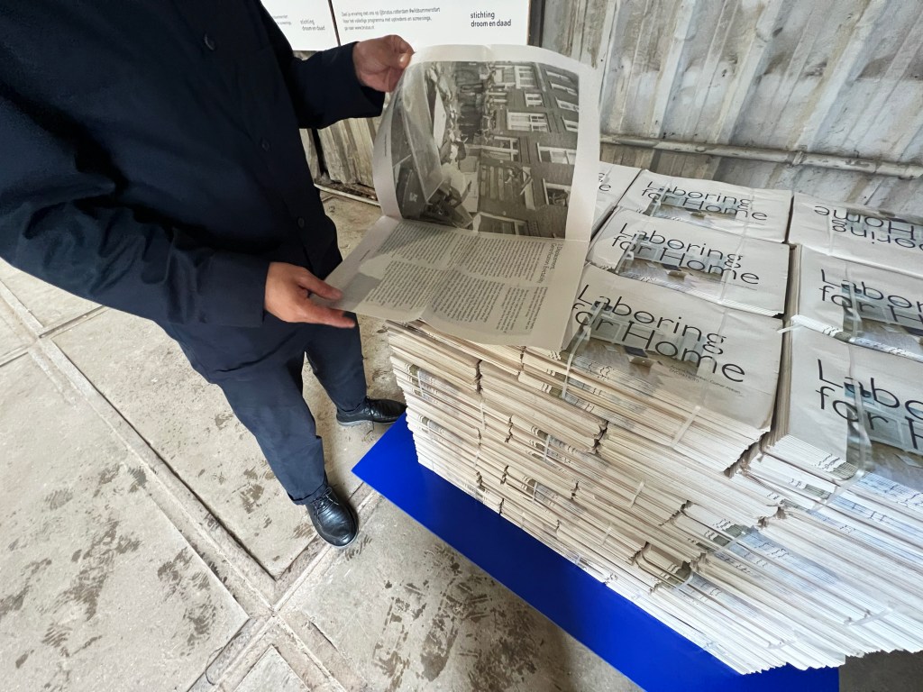 For the 2nd edition of Wild Summer of Art (2024) at Brutus Space curated by Amira Gad in collaboration with Sophie de Vos, we contributed an installation made from a pile of newspaper bundles. The publication in the form of a newspaper was produced to be free to take, which included an essay looking at precarity in labor and domestic life through architecture, social movements such as rent strikes and migrant workers’ activisim in the Netherlands, citizenship, gentrification, and eviction. This text was originally commissioned by and published as a contribution to WORKPLACE, which is a collaboration between e-flux Architecture and the Canadian Centre for Architecture within the context of CCA’s year-long research project Catching Up With Life.