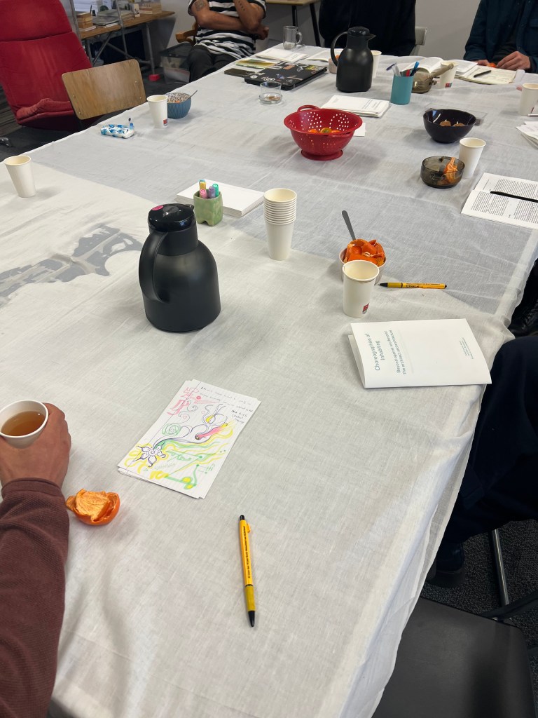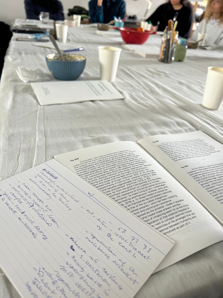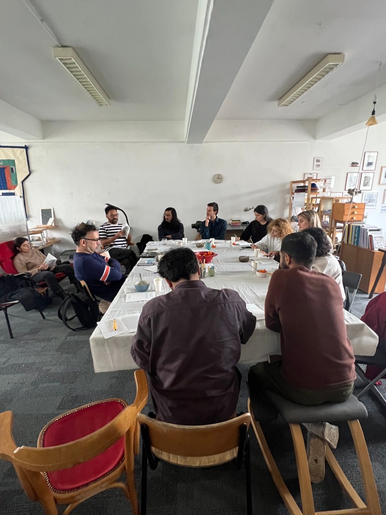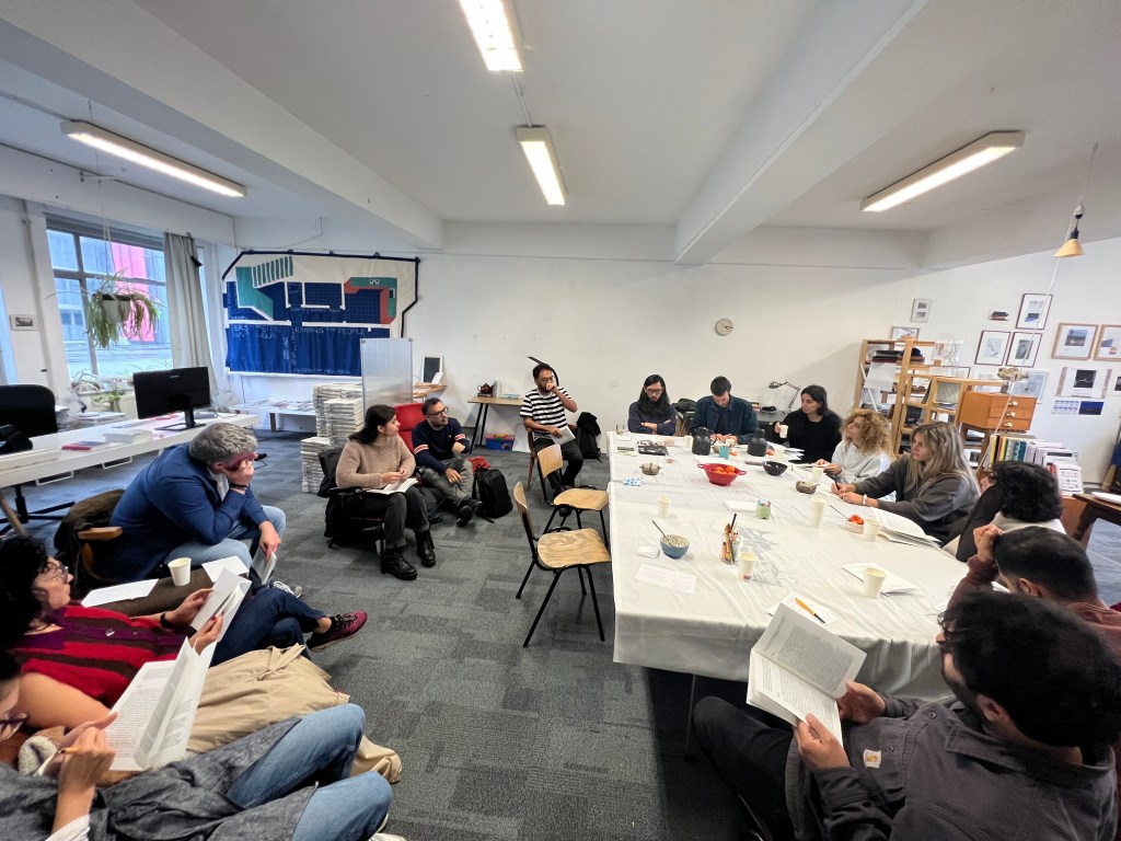 The session starts with reading and discussion over lunch, and end with a collective fiction writing session guided by Felipe.